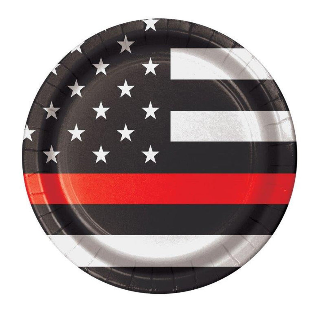 This 8 pack of round paper party plates sets the tone for a Firefighter Celebration. Let your veterans and new recruits know you support them with Firefighter Party Supplies. Also available in Luncheon Napkins, Cups, and a big mylar balloon. Patriotic, supportive, thankful-- throw a party!