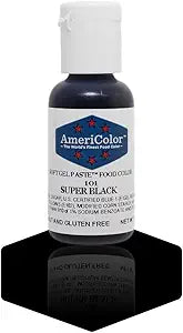 AmeriColor Gel Paste - Super Black oz : Superior, vivid color that is highly resistant to fading and running. Super-concentrated gel wont thin icing or break down delicate buttercreams or whipped icings. Can be used for icings (including buttercream, royal, and whipped), bread and cookie doughs, cake batter, fondant, marzipan, and gum paste. Squeeze bottle with flip-top lid allows for precise, accurate coloring that is consistent from batch to batch. 3/4 oz. bottle.