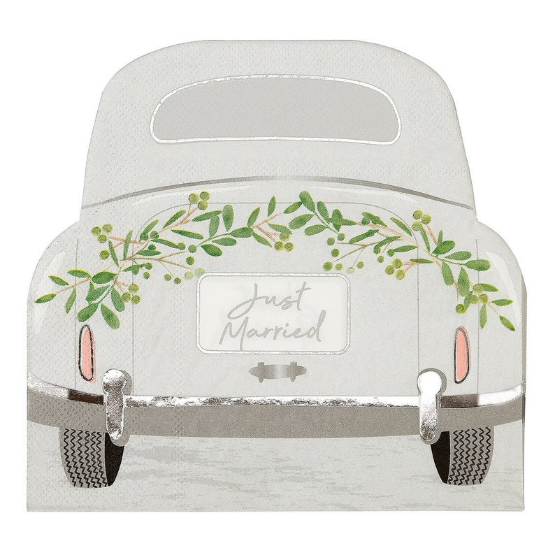 Just Married! Toot toot, here comes the happy couple! Perfect for cake crumbs and tasty desserts. Each pack includes 16 paper napkins.