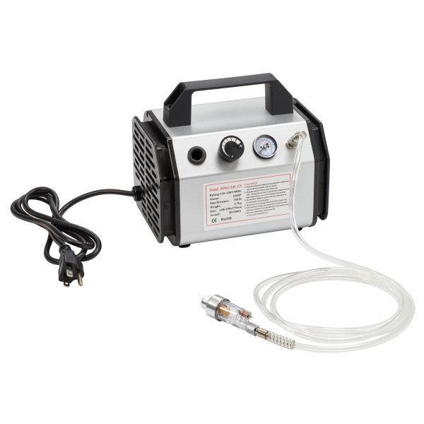 Complete airbrush compressor features an oil-less piston design with auto start and stop. Built in airbrush holder, pressure gauge and moisture trap. Hose included. Max pressure 35 PSI, 115 volt.
