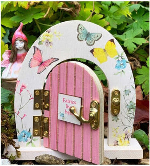 Wooden Fairy Door by Talking Tables. Features a pink wooden door, ‘fairies live here’ sign, butterfly design as well as gold hinges and door handle for a realistic look. Simply place the door on a bedroom wall or against a tree in the garden to let the fairies in! Use in a child’s bedroom as home decor, in the garden or as a party decoration for a fairy themed birthday. It can also be reused every time the tooth fairy visits to keep the magic alive! Size: 120mm x 120mm x 7 mm.