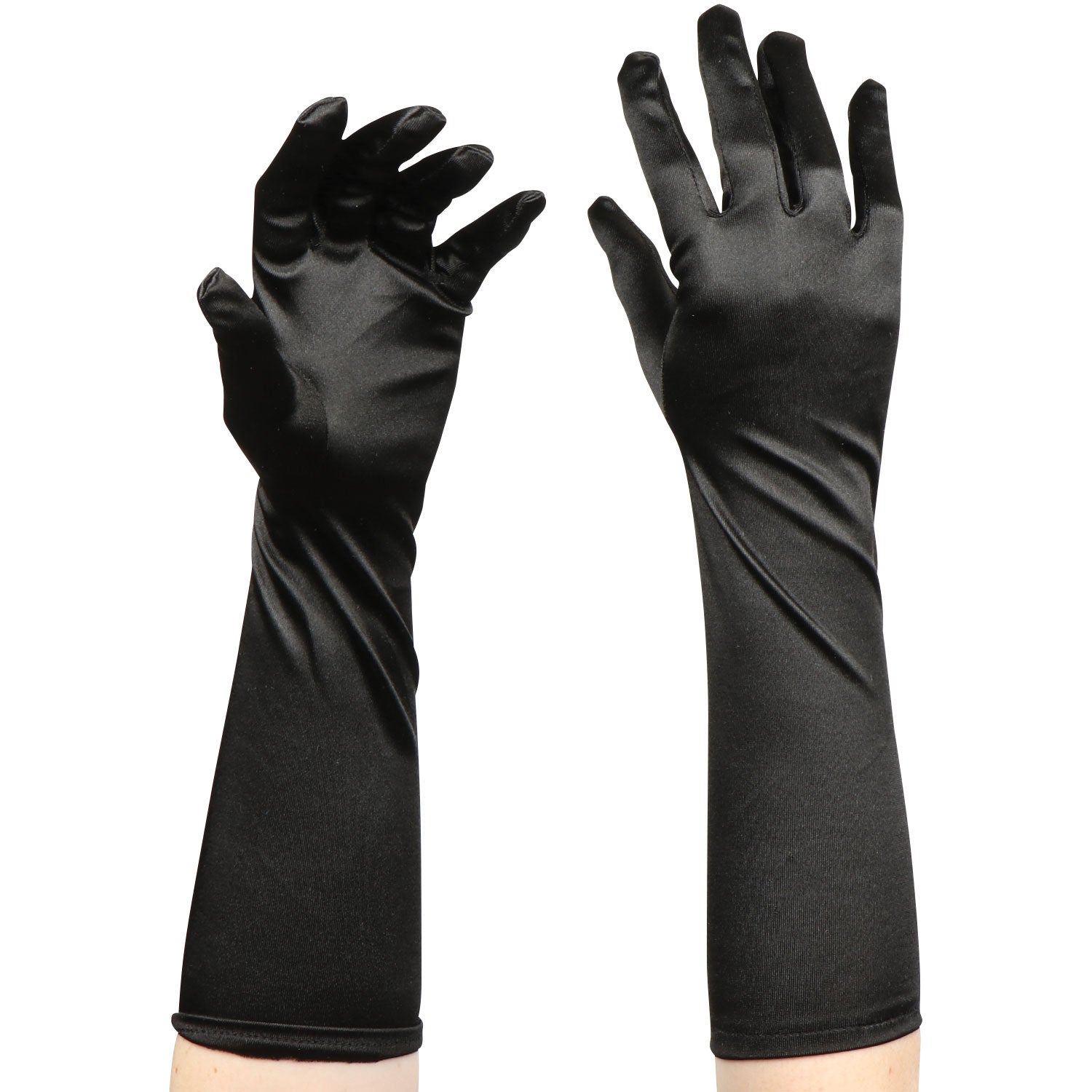 Black, satin gloves are 15.5" long. Luxurious fabric with solid construction.