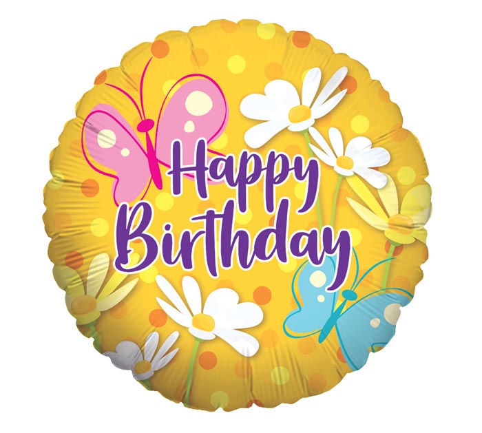 17" packaged round helium helper foil balloon. Orange with polka dots, daisies and butterflies around the message "Happy Birthday".