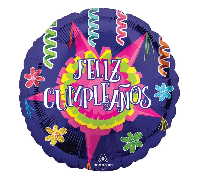28" Packaged foil balloon with a star pinata in the center and the Spanish message: Feliz Cumpleanos.