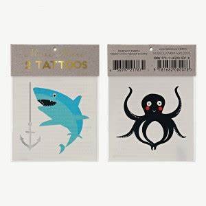 Throw a Jawsome Shark Infested Party with this Shark Party Collection! Temporary tattoos make brilliant gifts or entertainment at a party. This set features a toothy shark and a cheerful octopus, in bold colors and with shimmering foil detail.