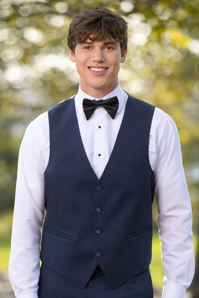 Rental ensemble includes coat, pant, shirt, tie, vest, and basic jewelry.