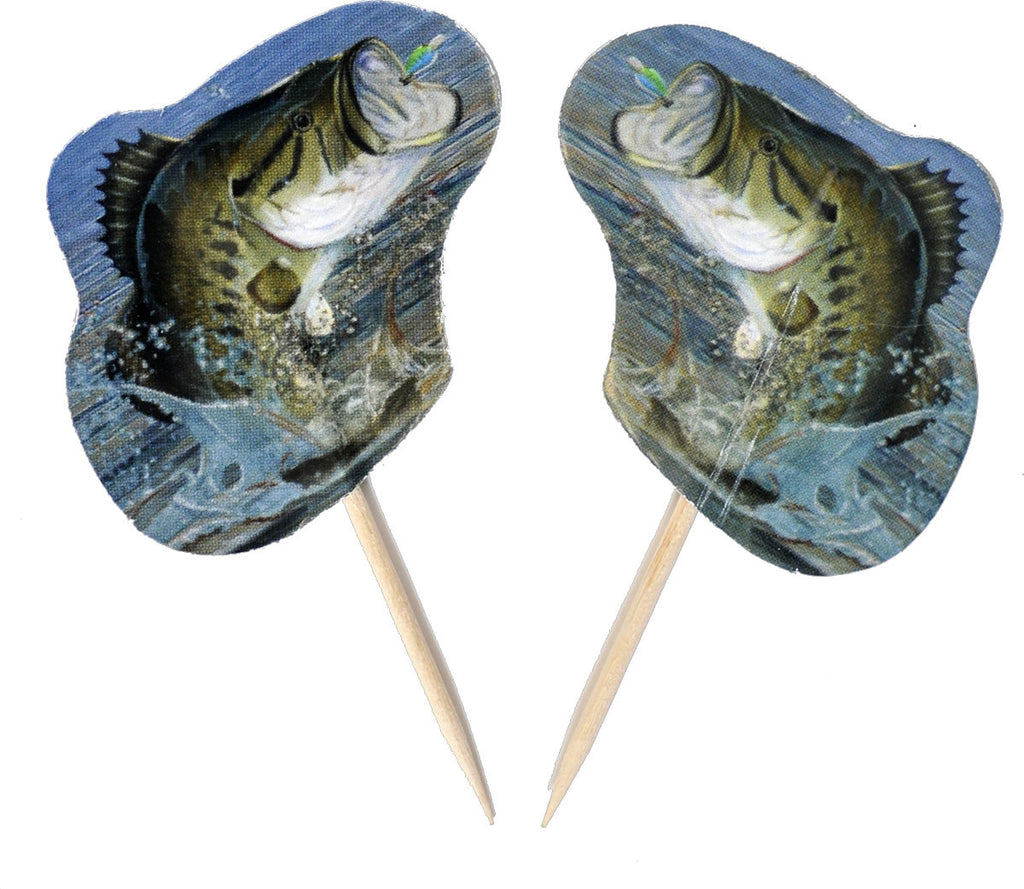 Bass fishing Party Picks are perfect for fishing themed cake or cupcakes. Package contains 24 picks and picks are 4 inches tall. Graphics printed on both sides