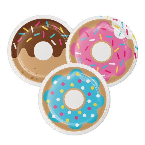 One Package of 8 Donut 7 Inch Cake/Dessert Plates. Featuring assorted plates in brown, pink and blue, these plates are perfect to use when serving appetizers, finger foods or desserts. Celebrate your donut theme party!